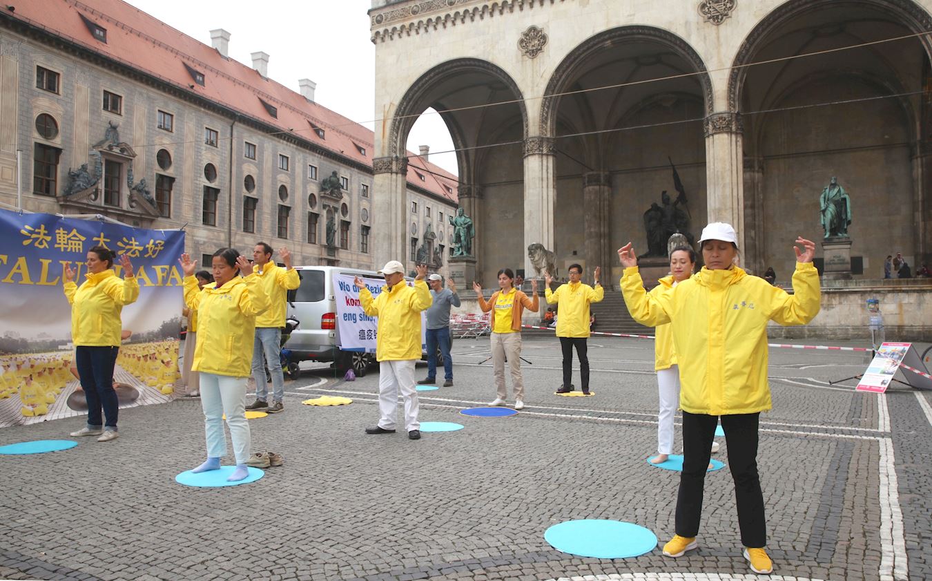 '图1:二零二零年六月六日,德国法轮功学员在慕尼黑奥迪安广场(Odeonsplatz)举办活动。'