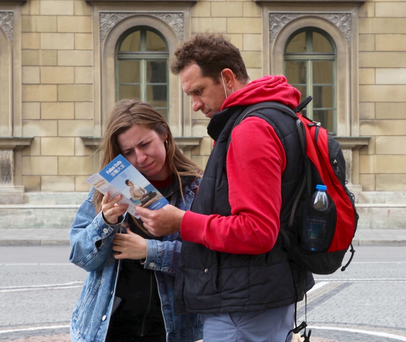 一对夫妇在信息台前跟法轮功学员交谈了很久并签了名,他们了解到法轮功学员修炼“真、善、忍”,觉得非常好,也知道中共的邪恶,他们建议法轮功学员多举办这类活动,让德国社会更加了解中共的罪恶。