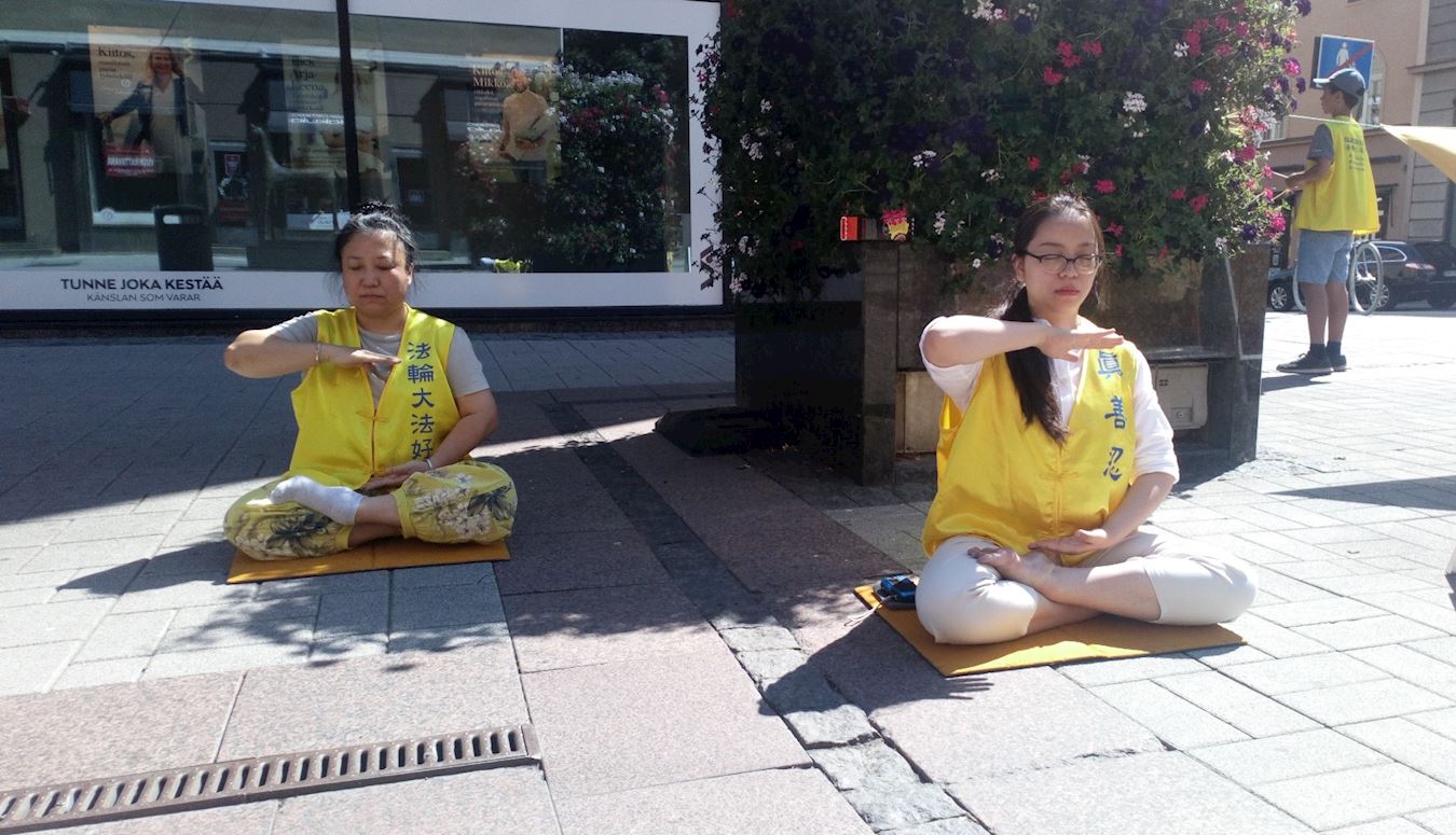 图1:芬兰法轮功学员在繁华的步行街上炼第五套功法。