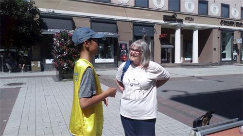 一位芬兰女教师,她在学校里教授文化和宗教信仰方面的课程。当看到是法轮功反迫害的活动,马上签名。她说:“我从事这方面的教学工作,知道法轮功。你们所作的是非常重要的事情。”