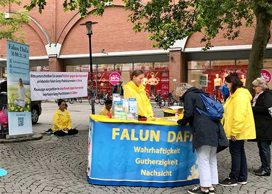 七月十一日,慕尼黑的法轮功学员在红十字广场举办信息日活动。学员们挂起“法轮大法好”和呼吁人们签名制止中共迫害法轮功的横幅,还有介绍功法和揭露中共迫害的展板。