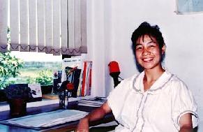 吴志平的妻子朱洛新,小时候住在广州市西关逢源正街道21号,八十年代初举家迁至澳门,一九八五年在澳门大学读书,毕业后曾在其叔叔澳门的一间大公司任职,淡泊名利、看破红尘的她决意到香港大屿山出家修行了一年。朱洛新后来在香港工作期间,不幸染上了一种皮肤病,全身奇痒无比,吃了许多药可止痒却不能根治,无奈之中在即将去加拿大留学的前夕回到广州处理事宜,而有幸参加了一九九四年十二月师父最后一期大陆广州传功讲法班。当场得到身体清理,皮肤奇痒不翼而飞,这使朱洛新感到身心为之震撼,决定放弃留在香港和到加拿大留学的机会,临时找了一份合资企业在广州郊外的“香满楼”牛奶公司的工作(照片是那时所摄)。