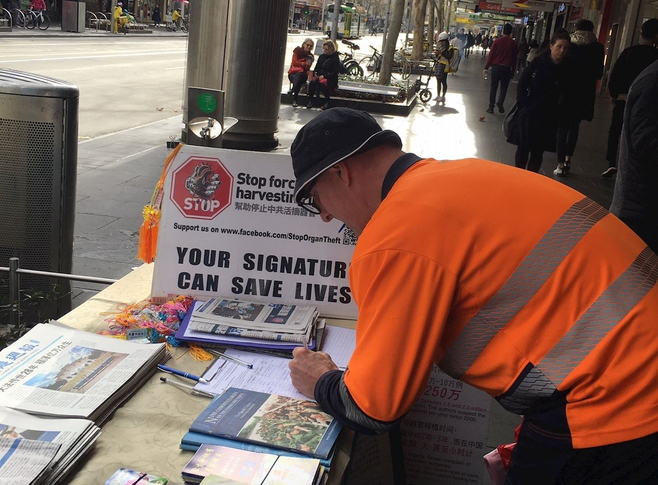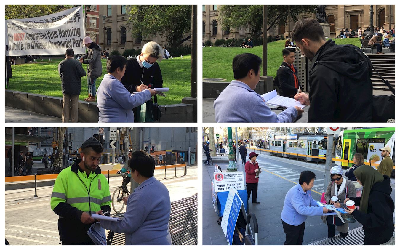 在墨尔本唐人街真相点,退休人士蕾妮(Renee)七月四日表示,在征签表上签字是因为:“中共对法轮功的迫害持续了二十一年,太长了。人类应该互相尊重,活摘器官不应该发生。每一个人都应该站出来反对这场迫害。”
