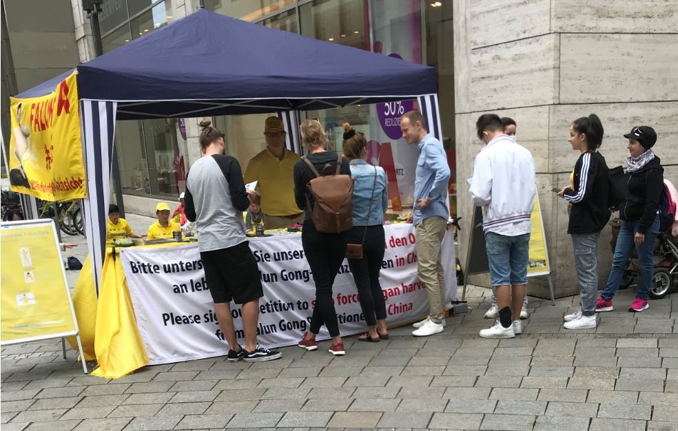 法轮功学员们展示功法时,祥和的能量场总能吸引很多路人驻足观看。一位中年女士带着女儿来到信息台前,她表示自己经常去中国,但以前没听说过法轮功和活摘器官。学员告诉她,中共对被关押的法轮功学员体检,并建立了一个数据库,按需摘取他们的器官卖钱。她忙问:“我怎么做可以帮助你们?”学员告诉她,可以在反对中共活摘器官的签名表上签名,她毫不犹豫地签了名,并拿了传单。