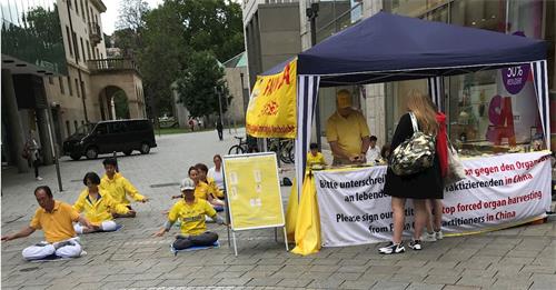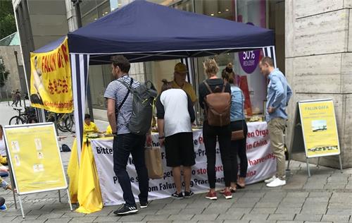 一位金发女士在展板前看了很长时间,学员递给她传单,并告诉她法轮功学员在中国被活摘器官。她马上问:“我可以签名(反对活摘)吗?”签完名后,她表示想学炼法轮功,得知法轮功学员每周日都会在火车站附近的公园炼功后,她高兴地表示会去。