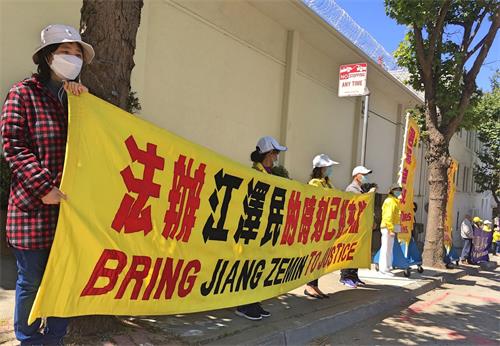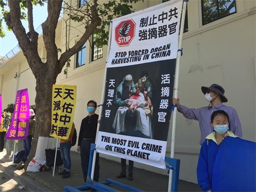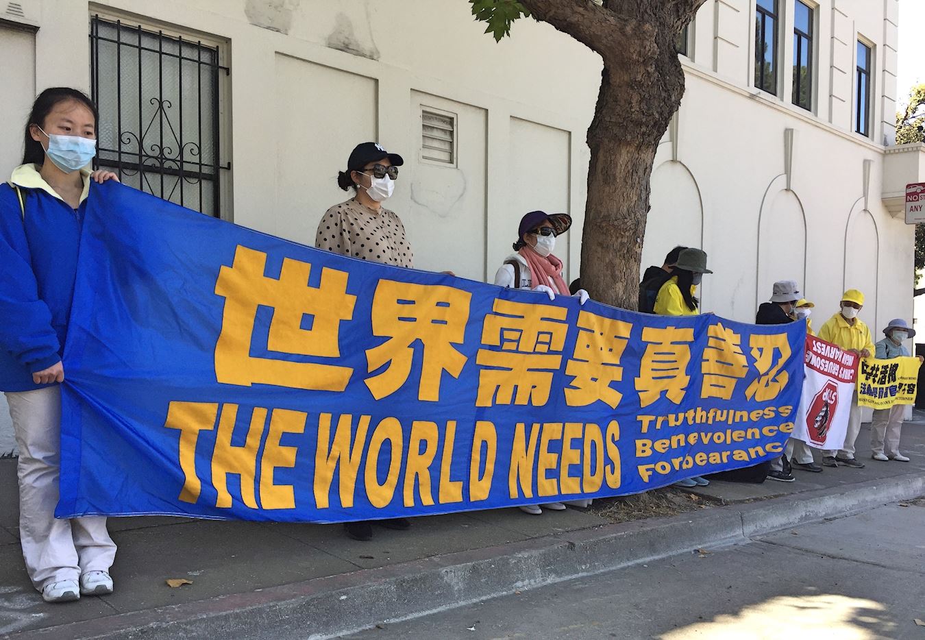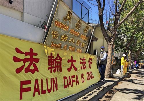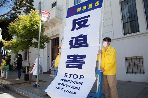 七月十七日当天上午,大约一百位旧金山的法轮功学员陆续来到中领馆前,打出“法轮大法好”、“世界需要真善忍”、“停止迫害法轮功”、“法办江泽民”、“制止中共活摘法轮功学员器官”、“天灭中共 退党自救”等横幅。学员们按照政府戴口罩、保持社交距离等规定,在祥和的音乐中,静静的发出,呼唤世人快找真相,认知中共邪恶,解体中共,共同制止迫害的心声。