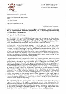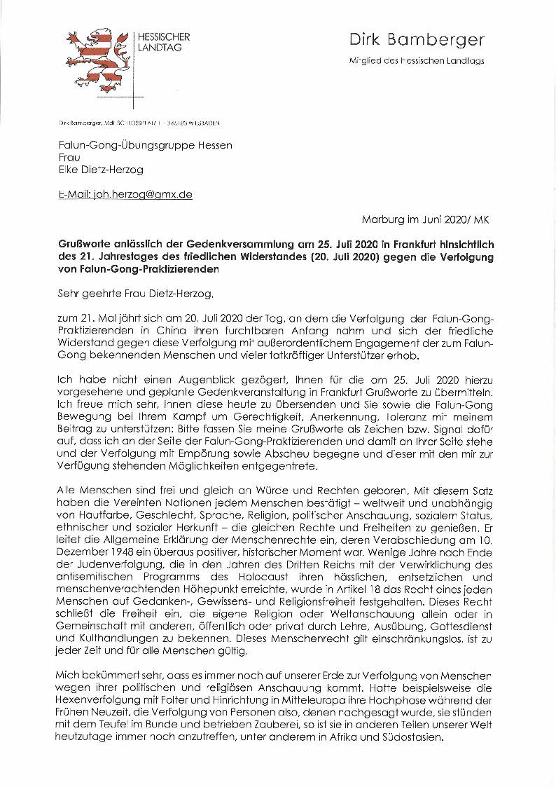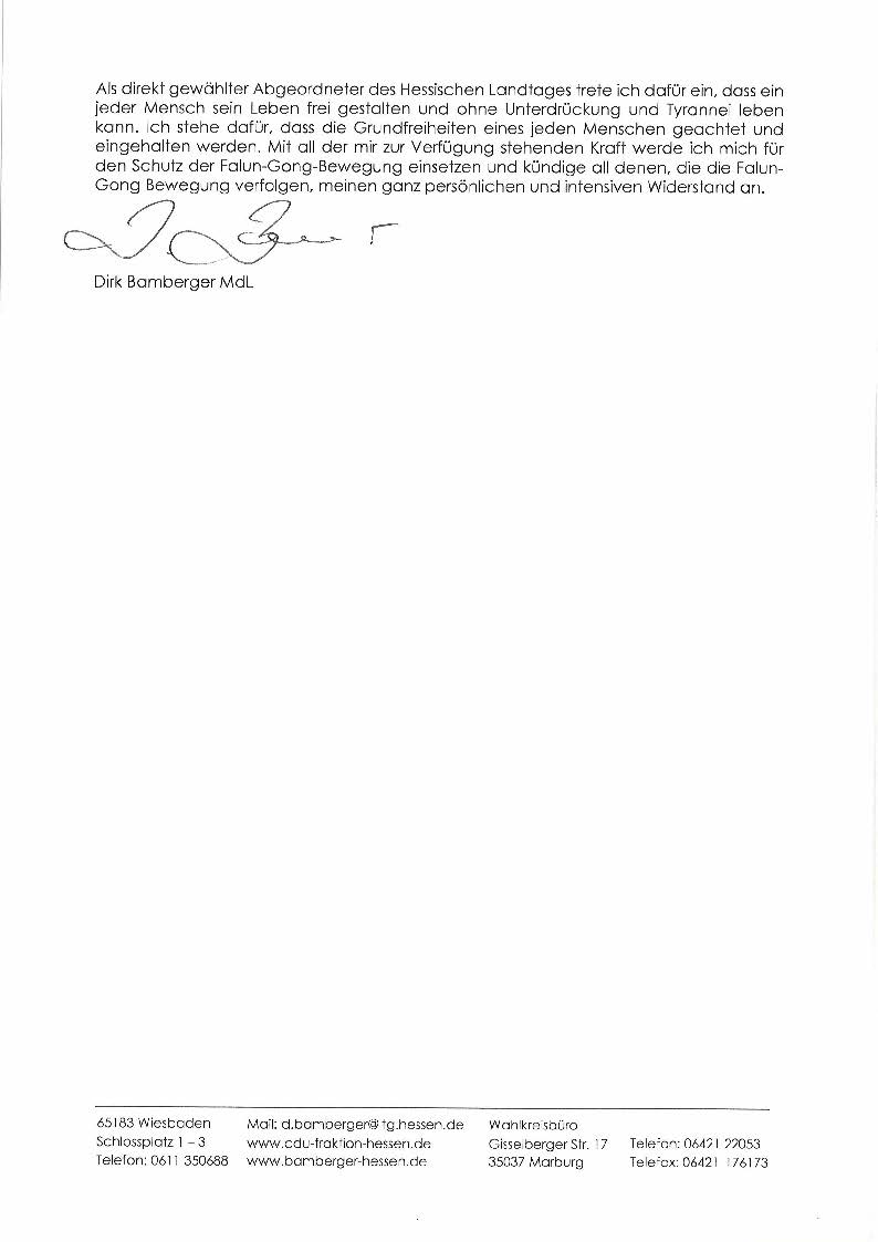 黑森州执政党基民盟(CDU)议员议员德科·斑驳格尔(Dirk Bamberger)先生在信中写道,他“没有一刻犹豫”的写了致词,来“表达对您(法轮功学员),和对追求正义、认可法轮功运动的支持”。他写道:“我站在法轮功学员的一边”并“对这场迫害感到愤怒和唾弃”,并表示要“尽我所能来抵制(迫害)”。