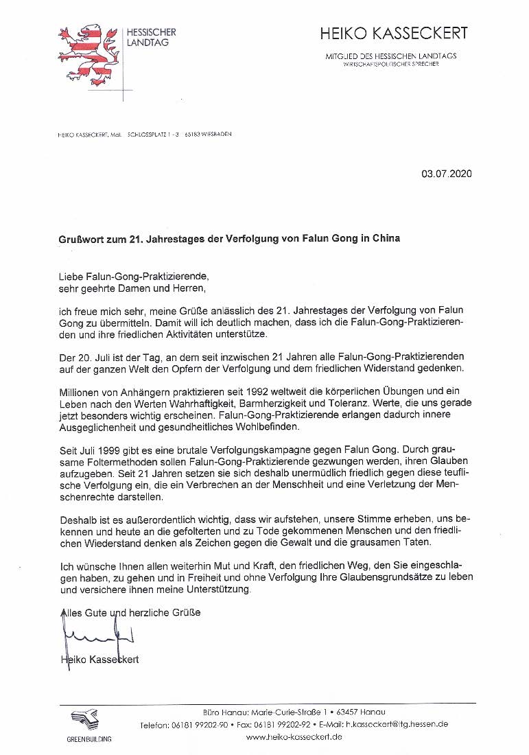 同是黑森州基民盟(CDU)的议员海阔﹒卡瑟克尔特(Heiko Kasseckert)先生也表示自己“非常乐意”用信“明确表达对法轮功修炼者以及他们和平的活动的支持”。他写道:“二十一年来,他们(法轮功学员)坚持不懈的以和平方式抗议这场恶魔般的迫害,这场反人类、侵犯人权的迫害。”