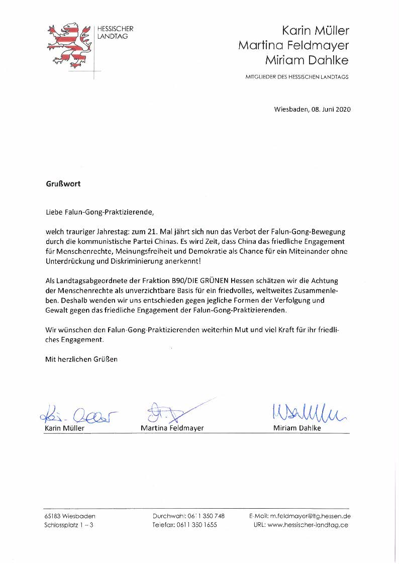 黑森州副议长卡林﹒穆勒(Karin Mueller)女士,和议员玛蒂娜﹒费德迈尔(Martina Feldmayer)女士及米立昂﹒达尔科(Miriam Dahlke)女士都是绿党成员。她们表示,七月二十日“是一个这样悲哀的纪念日”。她们还明确指出,是“中共”禁止人们炼法轮功,希望中国能尊重人权,并表示,“我们珍视对人权的尊重,并视其为全世界和平共处不可或缺的基础”。“我们祝法轮功学员继续保持他们(和平抗争)的勇气和力量”。