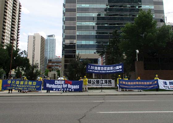 为纪念反迫害21周年,加拿大卡尔加里部份法轮功学员7月17日身着黄色T恤在中领馆前集会,曝光中共罪恶,呼吁解体中共。