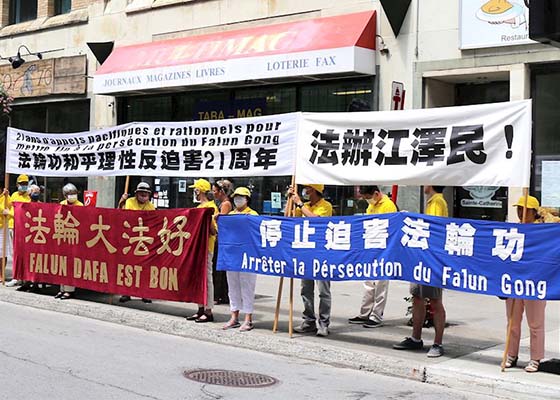 加拿大魁北克部份法轮功学员7月16日在中共驻蒙特利尔总领馆前举行集会,抗议中共迫害法轮功长达21年之久,呼吁解体中共,停止迫害。