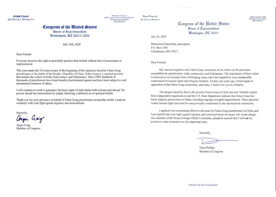 2020年7月20日是法轮功学员和平反迫害21周年。美国明尼苏达州的两位国会议员分别致信当地法轮大法学会,表达对反迫害的支持。