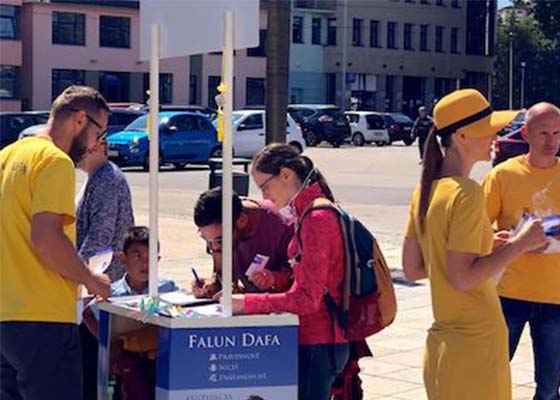 斯洛伐克法轮功部份学员7月14日在北部城市马丁的市中心广场举办信息日。学员们有的展示法轮功功法,有的开始派发法轮功真相传单。