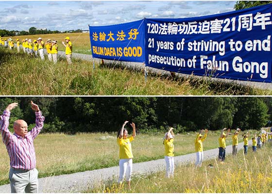 二零二零年七月十八日天气炎热,上午九点半瑞典法轮功学员聚集在中共驻瑞典大使馆前,抗议中共自一九九九年七月二十日至今。