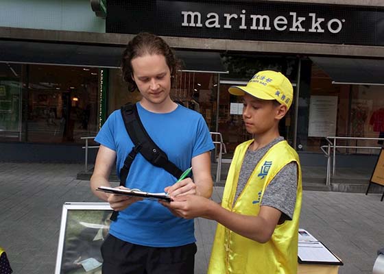 部份芬兰法轮功学员7月15日来到拉赫蒂市弘扬法轮大法“真善忍”的美好,并告诉当地民众中共对法轮功的迫害已经长达21年之久。
