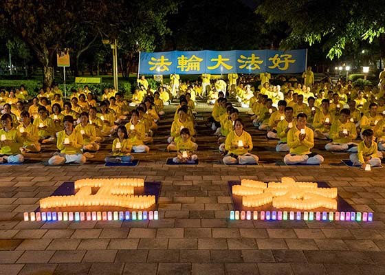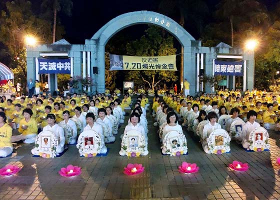 台湾高雄部份法轮功学员7月18日在卫武营都会公园、凤山新强公园举行集会和烛光夜悼会,谴责21年来中共对法轮功学员的残酷迫害。