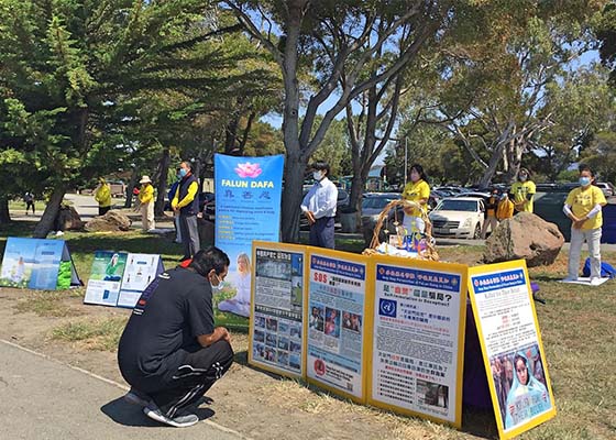 在法轮功学员反迫害二十一周年之际,七月十八日,旧金山东湾地区的法轮功学员来到风景如画的圣丽安珠海边公园集体炼功,传播法轮功的真相,同时揭露中共的邪恶。