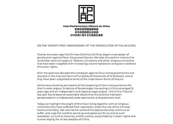 正值中共迫害法轮功21年之际,由十几个民主国家的上百位议员组成的“对华政策跨国议会联盟”7月19日在推特上发表声明,敦促世界各国为结束迫害发声。