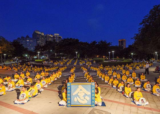 七月十八日傍晚,来自台湾台中地区的法轮功学员,在台中市文心森林公园比邻而坐,一盏盏烛光,汇聚善念。