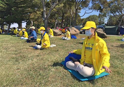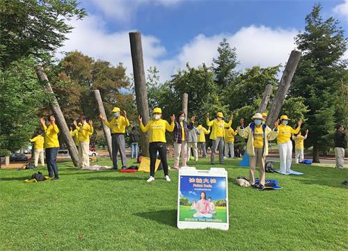 当天上午,风和日丽,虽然受中共疫情的影响,很多商店依然关门,不过却有很多人到公园散步和做运动。法轮功学员除了集体炼功,并设立了真相桌和陈列了一系列真相展板。许多路人驻足观看。