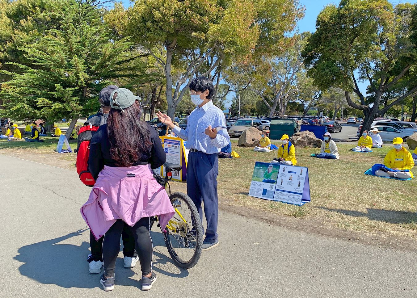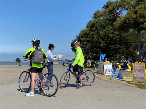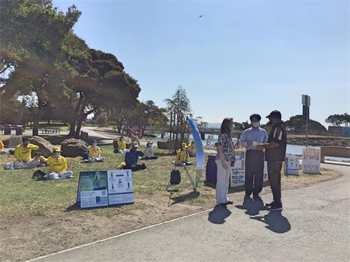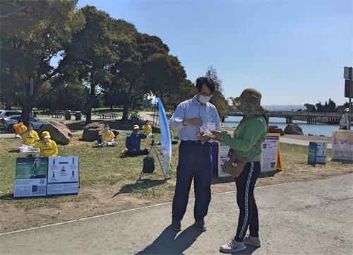 一位黑人男士与学员交谈。学员跟他谈到:法轮功弘传世界一百多个国家和地区。有上亿人修炼,心身受益。你看看这么美好的功法却遭到中共的打压。中共二十多年来一直残酷迫害法轮功,使许多善良的法轮功学员被迫害致死。他说:这个功法看上去很平和,很好。我会上网看看。学员还跟他谈到:这次中共隐瞒事实,使中共病毒漫延全球,几十万人失去生命。他说:共产党剥夺人的信仰,自由,对人本身是很残酷的。这次中共使病毒传向世界我们才看到了,了解了中共的本质。我会在这个拒绝中共的连接里去签名。