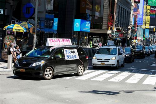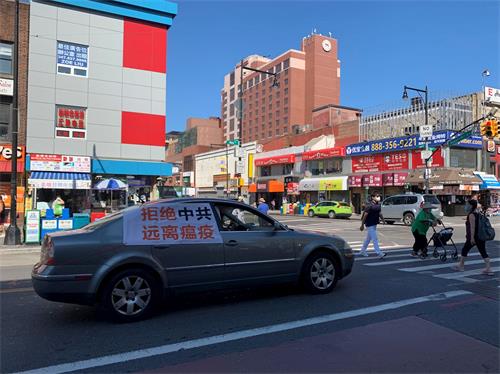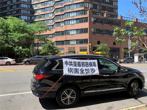 【明慧网二零二零年七月二十日】二零二零年“七·二零”是法轮功学员反迫害二十一周年,七月十八、十九日周末两天,纽约法轮功学员组成“真相车队”环绕三大华人社区和中领馆,告诉世人“中共是最邪恶病毒,祸害全世界”、“拒绝中共,远离瘟疫”,沿途所到之处,吸引不少路人拍照,并向车队竖起大拇指表示赞许。
