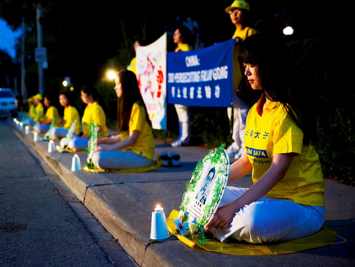 图25~28:晚上8点至10点,法轮功学员在多伦多中领馆前举行了烛光悼念,悼念在中国被中共迫害致死的法轮功学员。