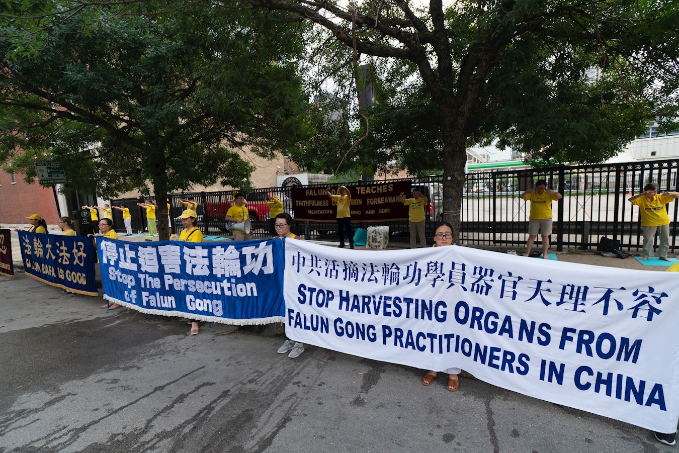 法轮功学员打出“法轮大法好”、“法轮大法教导真善忍”、“中共活摘法轮功学员器官天理不容”、“解体中共制止迫害”等中英文横幅,并集体炼功。