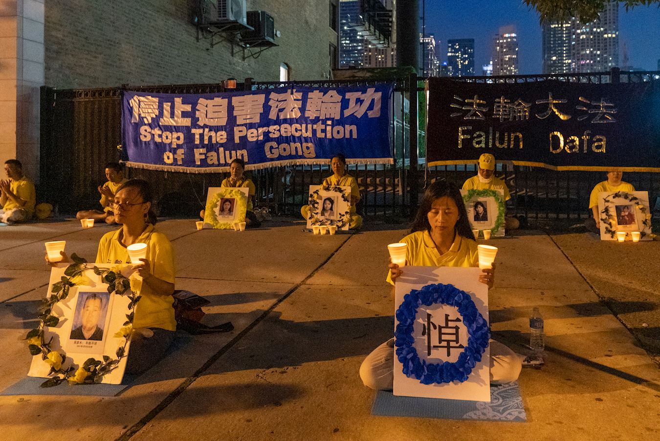 '图6~8:法轮功学员在芝加哥中领馆前举行烛光夜悼,悼念被中共迫害致死的同修。'