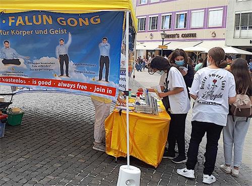 奥格斯堡市政厅广场位于市中心,来往公共交通车辆和行人很多,很多人都能看到法轮功的信息台和法轮功学员的功法演示。不少人在了解了法轮功真相之后,主动前往信息台签名,督促德国政府制止中共活摘法轮功学员器官,停止迫害法轮功。