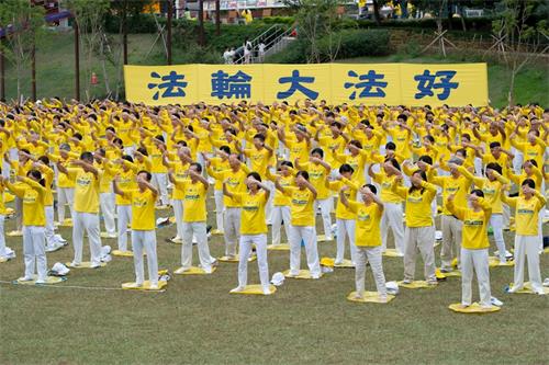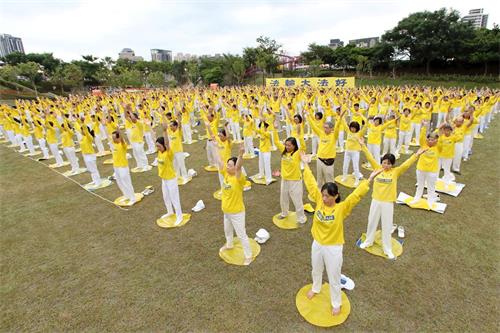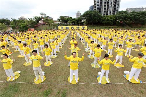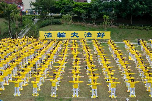'图1~6:二零二零年七月十九日,法轮功学员于桃园市风禾公园草坪上集体炼功,展示祥和的功法。'