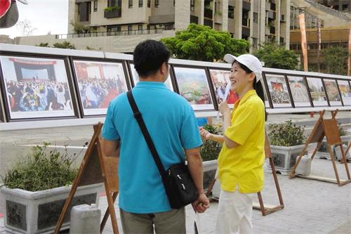 吴先生在看正法之路图片展时,看到第一张图片的文字写着“解体中共,复兴中华”,就向一旁讲真相的学员说:“法轮功在搞政治”,学员和善的引导他看展板,从一开始法轮功在大陆传出、获得褒奖、至洪传世界各地的画面;到中共迫害、活摘器官的恶行,再讲到世界各地学员反迫害的意义,这位先生明白了。