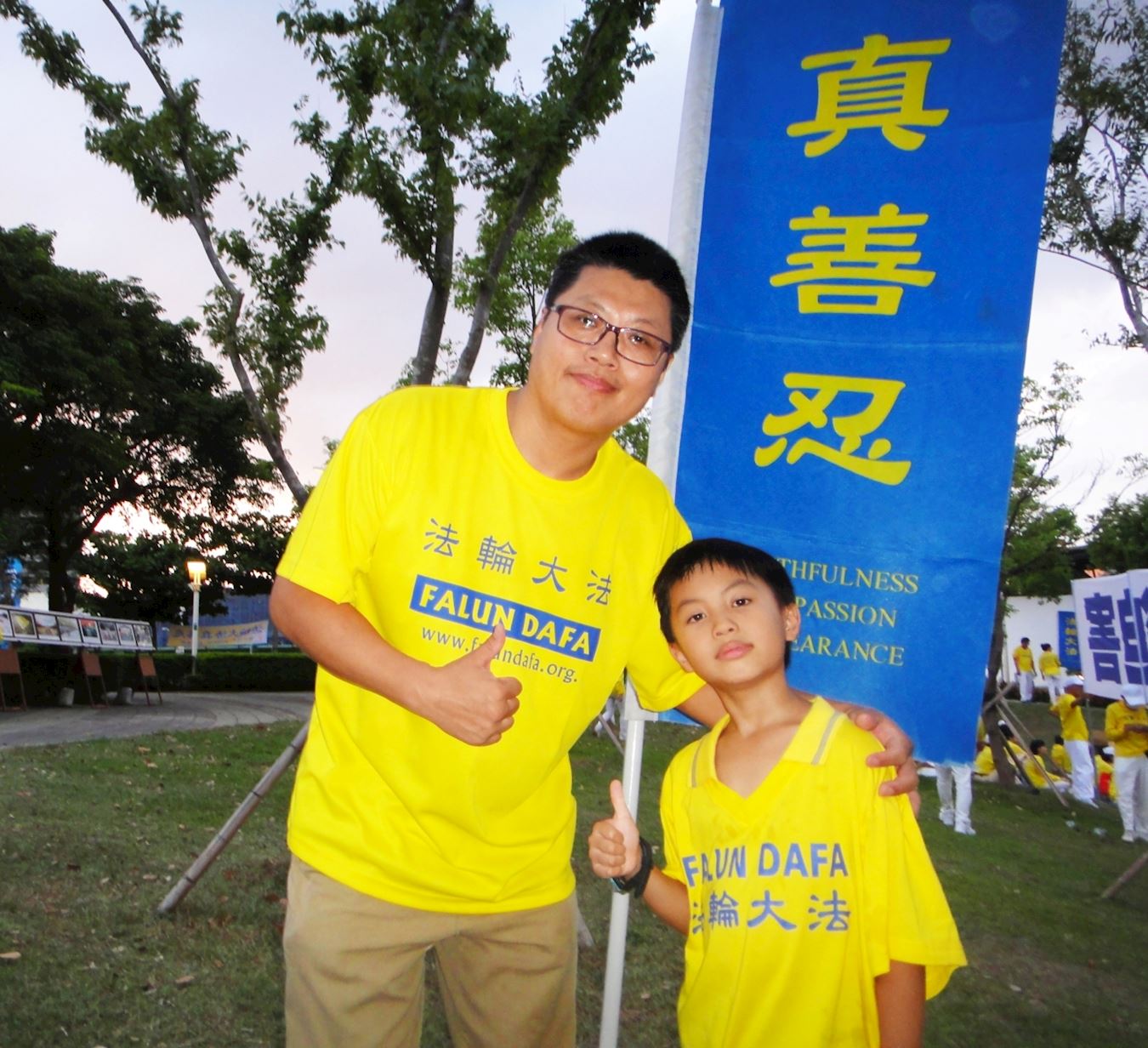 林岳奇带儿子来参加活动,希望让对法理尚待深入了解的孩子,能藉由参与活动更深入了解法轮功,并且珍惜修炼的机会,同时也希望能为法轮功反迫害尽一份心力。