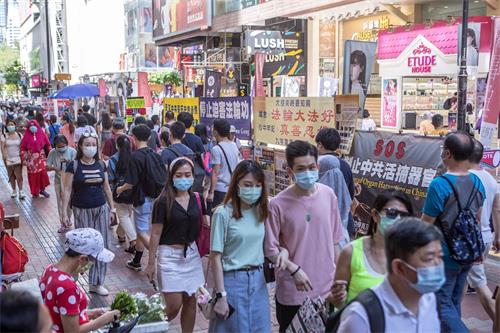 图5:七二零反迫害二十一周年,香港法轮功学员无惧国安法,遍地开花讲真相。图为旺角真相点,法轮功学员继续打出“天灭中共”、“停止迫害法轮功”等横幅。