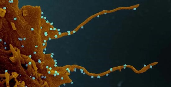图2:细胞被武汉肺炎(新冠病毒)感染后形成大量释放病毒的伪足(示意图,白色颗粒示病毒颗粒,图片自Elizabeth Fischer, Microscopy Unit NIH/NIAID.)