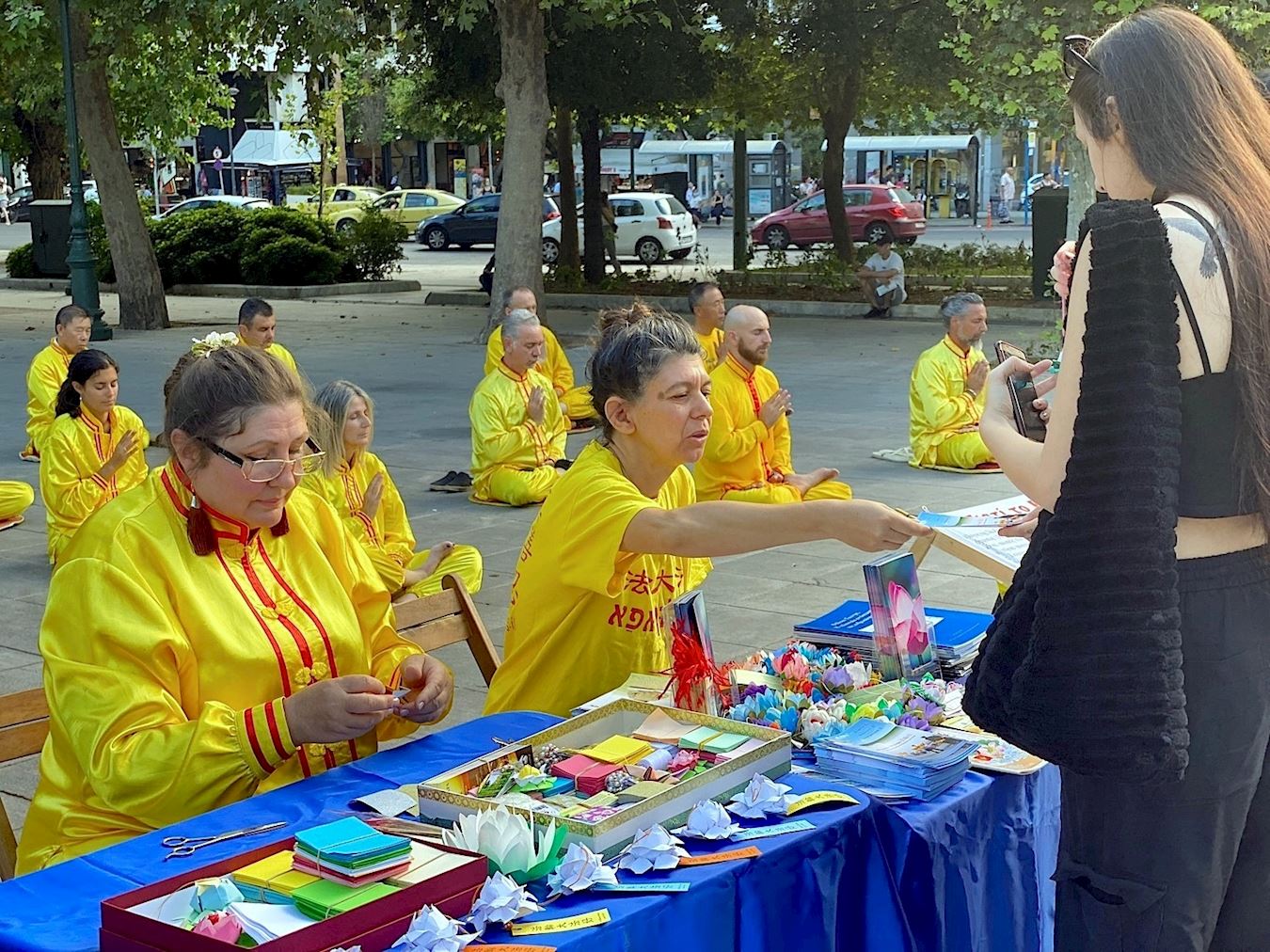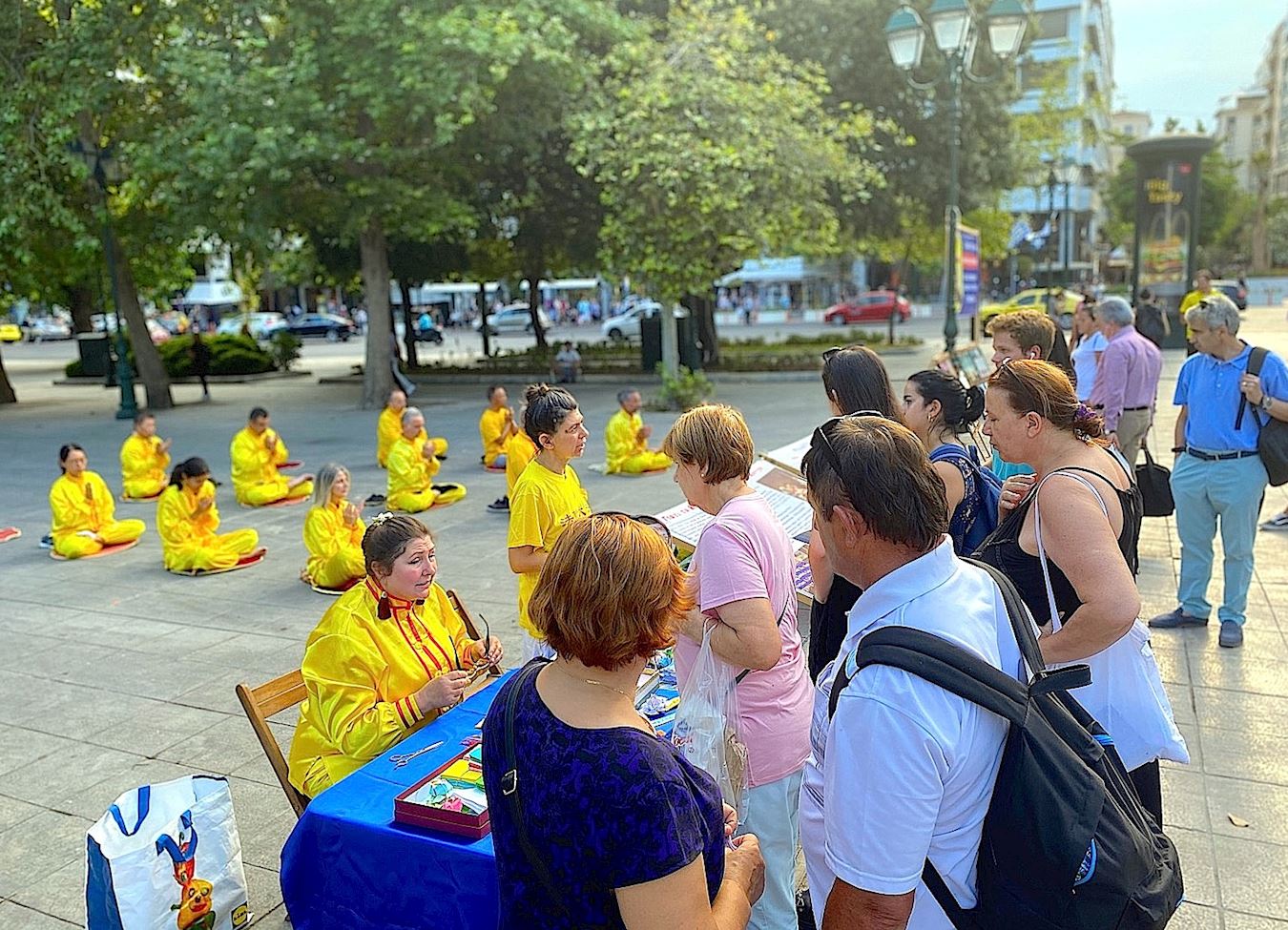 由于中共病毒引起的疫情,希腊仍有很多的限制,但仍有很多希腊人来到市中心。经过信息台时,人们随着广场上传出的优美祥和的炼功音乐,驻足关注这群身着黄色炼功服的法轮功学员们祥和的炼功动作,观看法轮功学员被迫害的真相展板,了解法轮功学员被强行活摘器官的违反人权的暴行真相。呼吁人们携手反对中共邪恶的暴行,结束迫害。