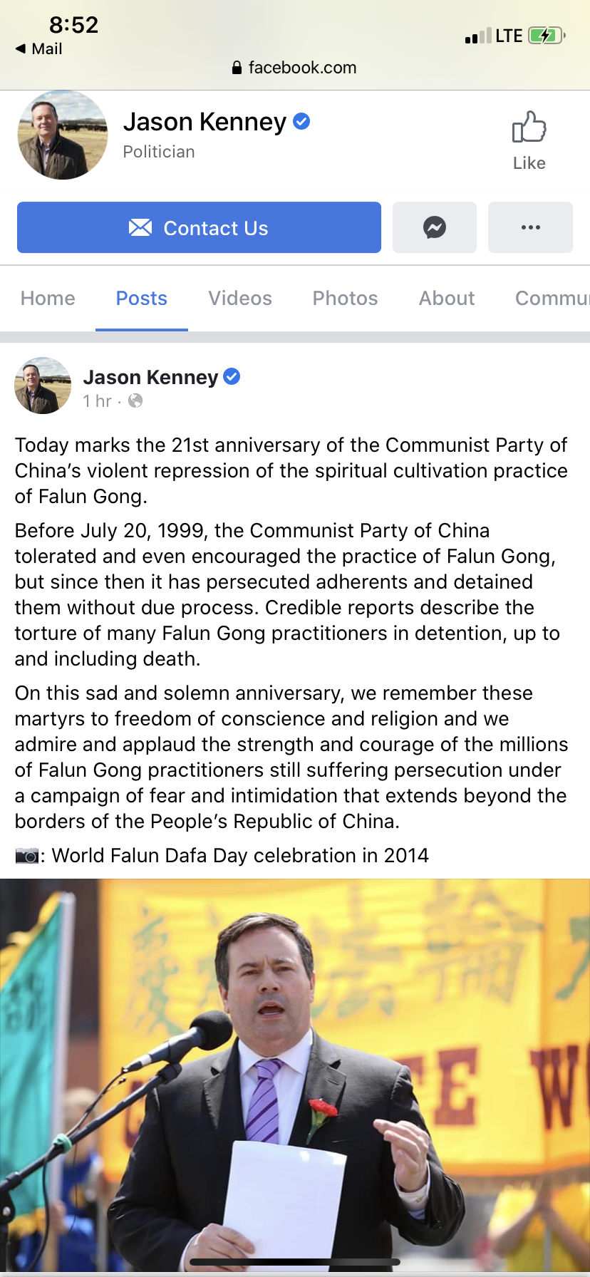 艾伯塔省省长杰森·肯尼(Jason Kenney)发来的声明中写道:今天是中国共产党暴力镇压法轮功修炼活动的21周年。