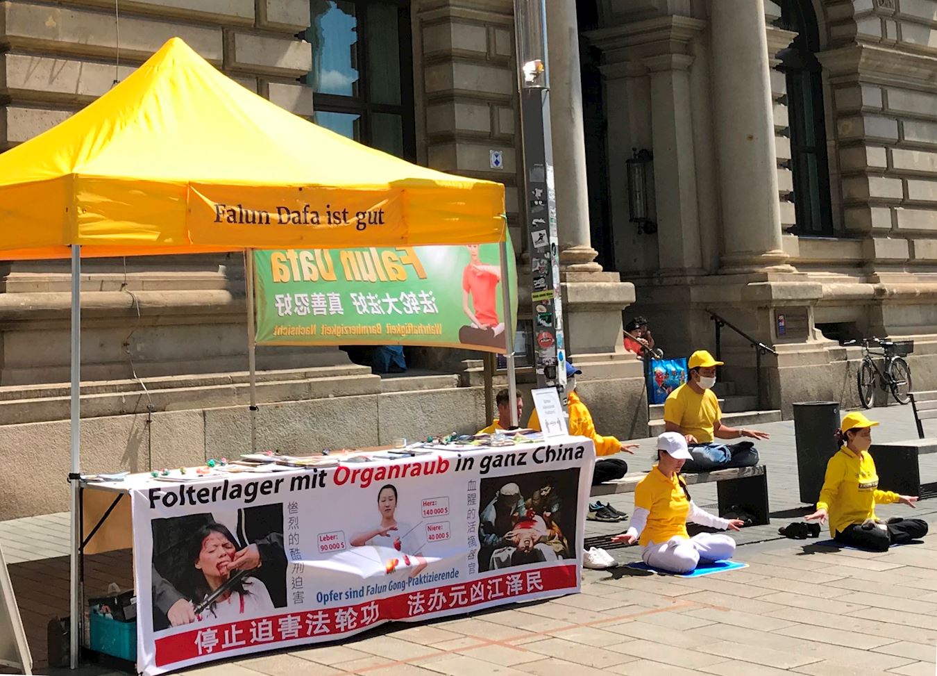'图1:二零二零年七月二十日,法轮功学员在德国东部名城莱比锡举办活动,谴责中共迫害。'