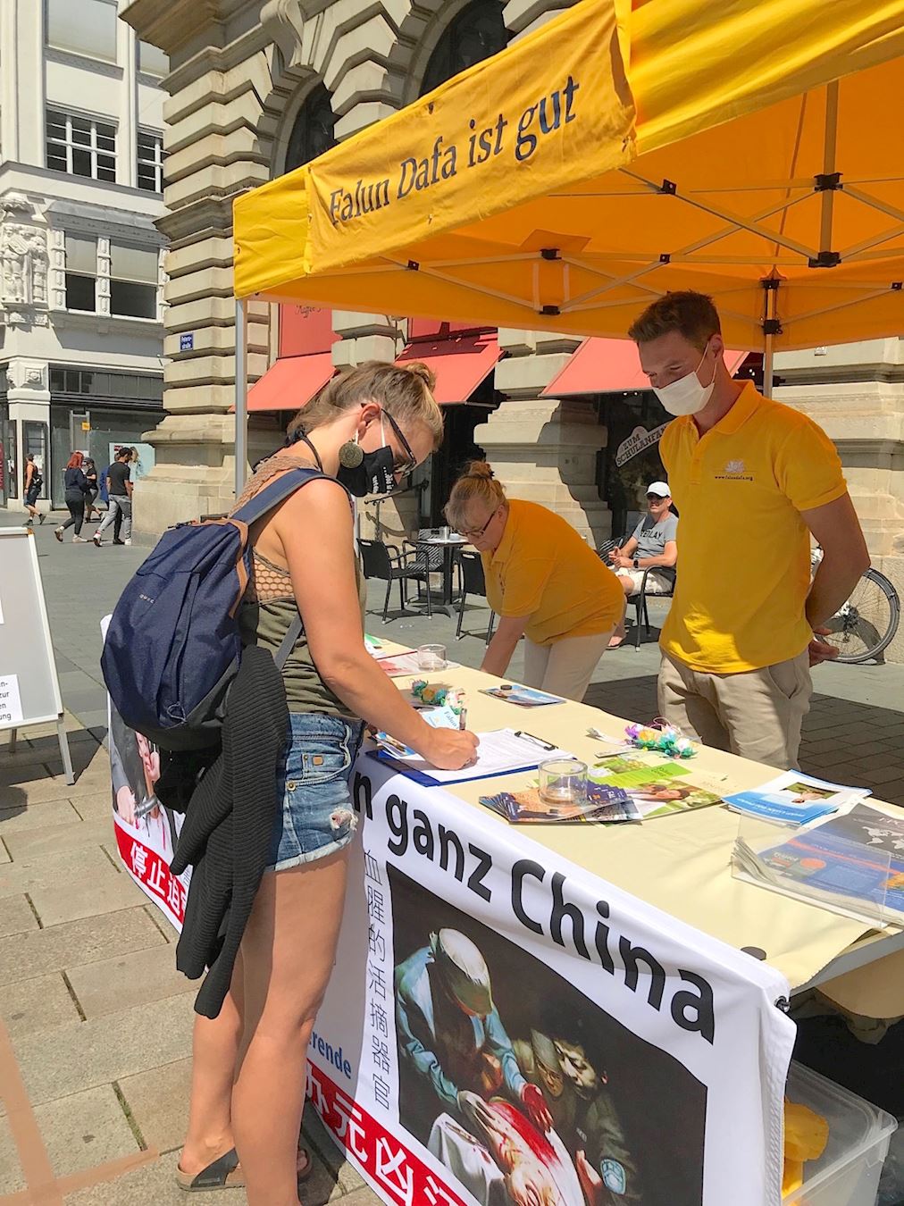 在莱比锡,法轮功学员展示了法轮功的五套功法。很多行人驻足观看,并想了解法轮功和中共迫害的真相。有位在德国器官移植基金会工作的女士签名之后对法轮功学员表示,人们因为信仰遭受迫害,器官还被盗取,这让她无法接受。