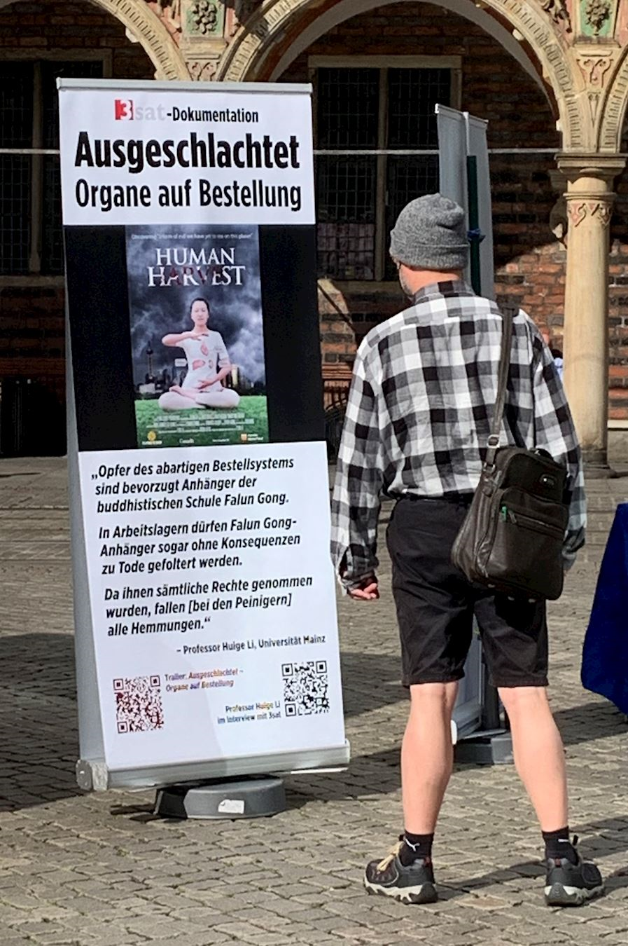 采斯芒先生(Zeißmann)已经退休,他在反对中共活摘法轮功学员器官的请愿书上签名。他不赞成在发生这种迫害的情况下德国还与中国进行贸易,他说:“因为对于这些人(跟中共经济往来的人)来说,挣钱比那里(中国)的人的生活更加重要,这很悲哀。”
