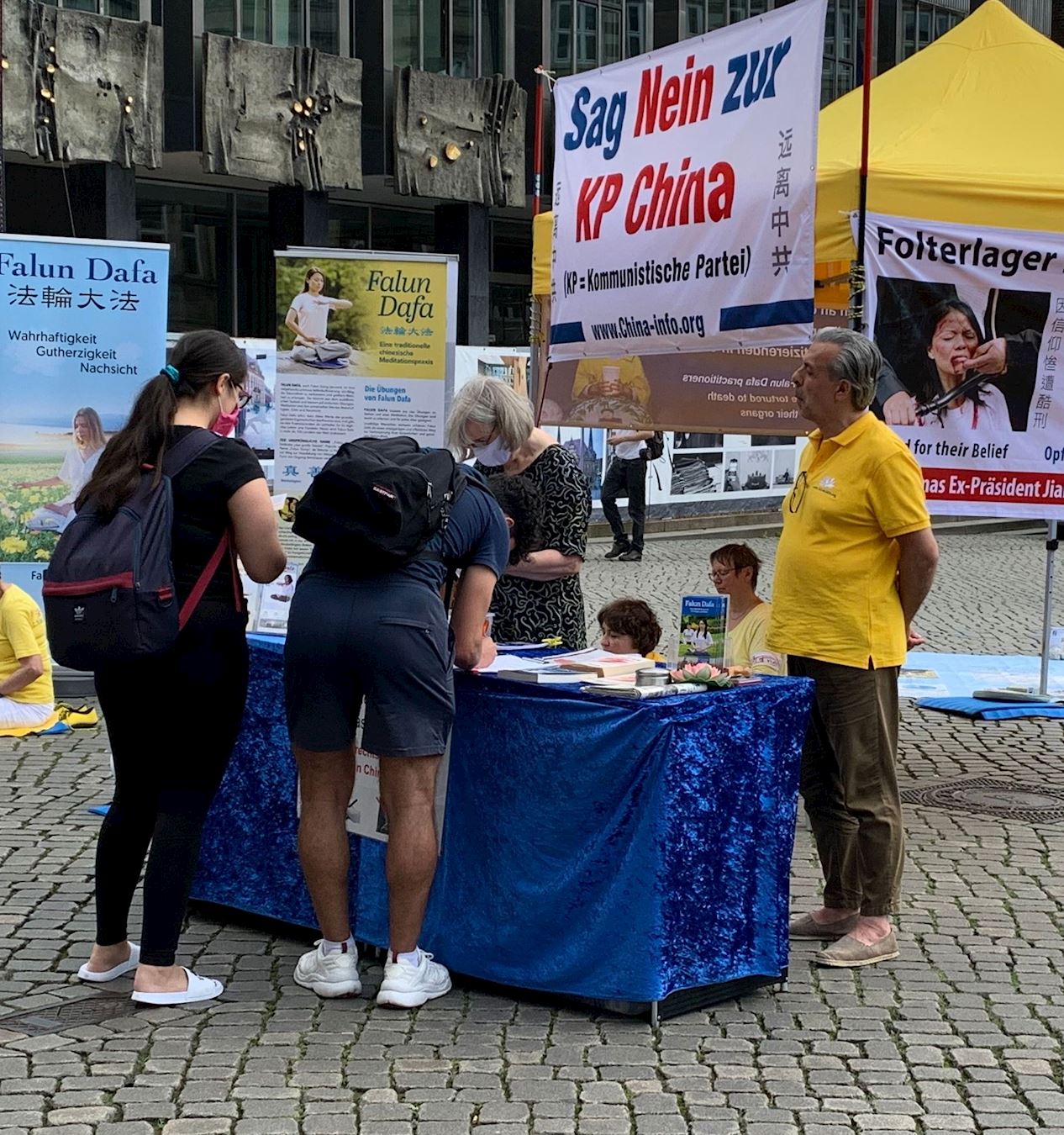 一位年轻的女士与学员进行交谈,学员向她介绍了功法。她问学员为什么一个政府会迫害这么好、这么和平的群体。当学员向她解释,因为共产主义本质上就邪恶,它排斥每个信仰。她马上就能够理解为什么会发生这样的迫害。她不明白为什么其它国家不对在中国发生的活摘器官的事情进行干涉,她觉得这是他们应尽的责任。