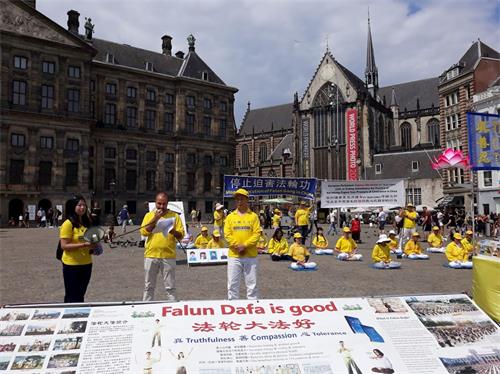 '图1~5:法轮功学员在荷兰首都阿姆斯特丹市中心的水坝广场(De Dam)举行讲真相活动。'
