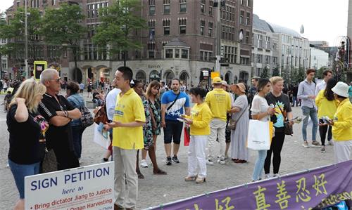 '图7~8:阿姆斯特丹市中心的水坝广场上,民众签名支持法轮功反迫害。'