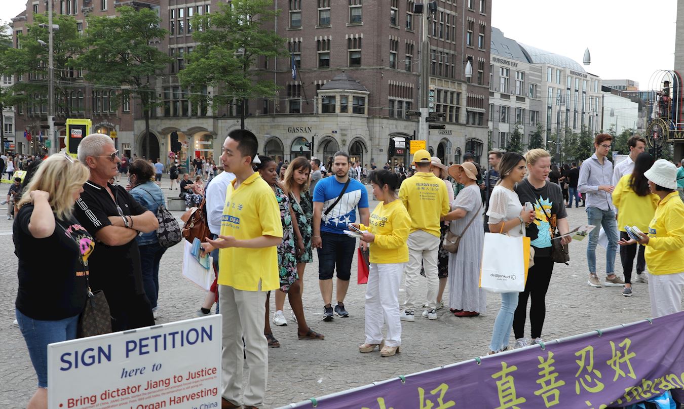 有一位法轮功学员向来往行人介绍迫害真相。荷兰人Jessica女士了解情况后表示:“我只看到这些人在和平的打坐,他们的内心一定很平静,我看不到他们哪里有错。我不理解,中国政府为什么要迫害他们?”另一位荷兰人Miriam女士表示:“当我看到‘停止活摘器官’征签时,我立即签字。因为每个生命都是重要的,我希望他们(中共)立即停止这种迫害。”