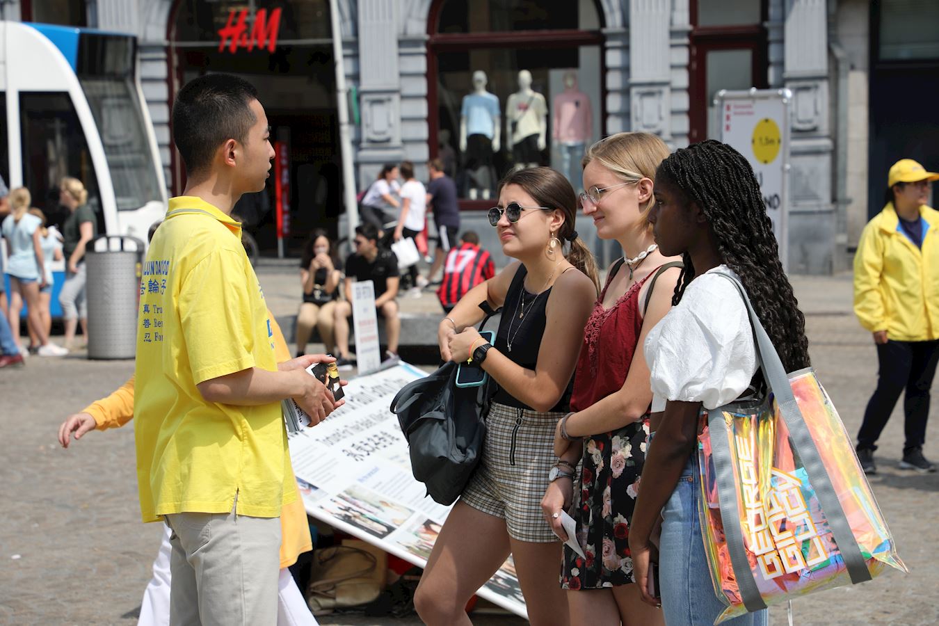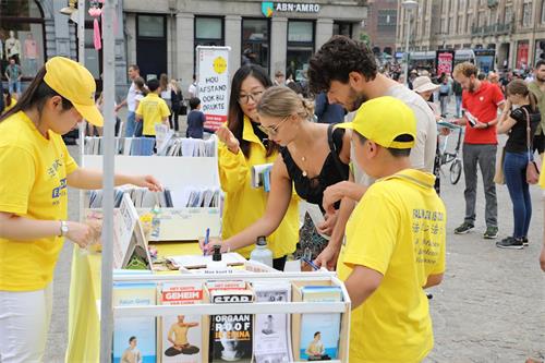 几位法轮功学员向往来游客介绍法轮大法洪传全世界的盛况,以及中共迫害法轮功的事实。一位来自荷兰最北部城市格罗宁根(Groningen)的民众表示想学法轮功,询问他所居住的城市有没有教功的地方。