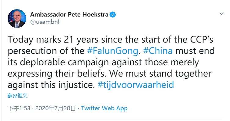 7月20日,美国驻荷兰大使Pete Hoekstra先生,在他的推特官方帐户上呼吁:“今天是中共开始迫害法轮功二十一周年的日子。中国必须结束对那些只是表达自己信仰的人们的镇压。我们必须站在一起共同反对这种不公正。”