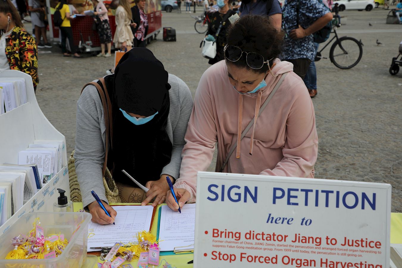图7~8:阿姆斯特丹市中心的水坝广场上,民众签名支持法轮功反迫害。