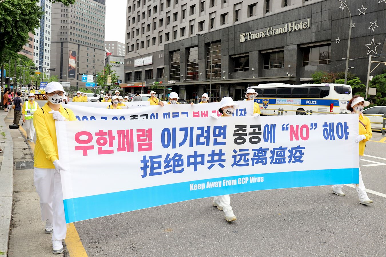走在游行队伍中的李熙升(音,男)是来自釜山的外科医生,每年他都会来支持和声援反迫害活动。这次活动中,法轮功学员们口罩上贴的“天灭中共”的标语,李熙升表示,“武汉肺炎,即中共病毒扩散到全世界,责任在于中共这一点,每个医护人员都会认识到”,“对自己的国民都这样残忍迫害致死,这样惨无人道的中共,当然老天要毁灭它啊!”