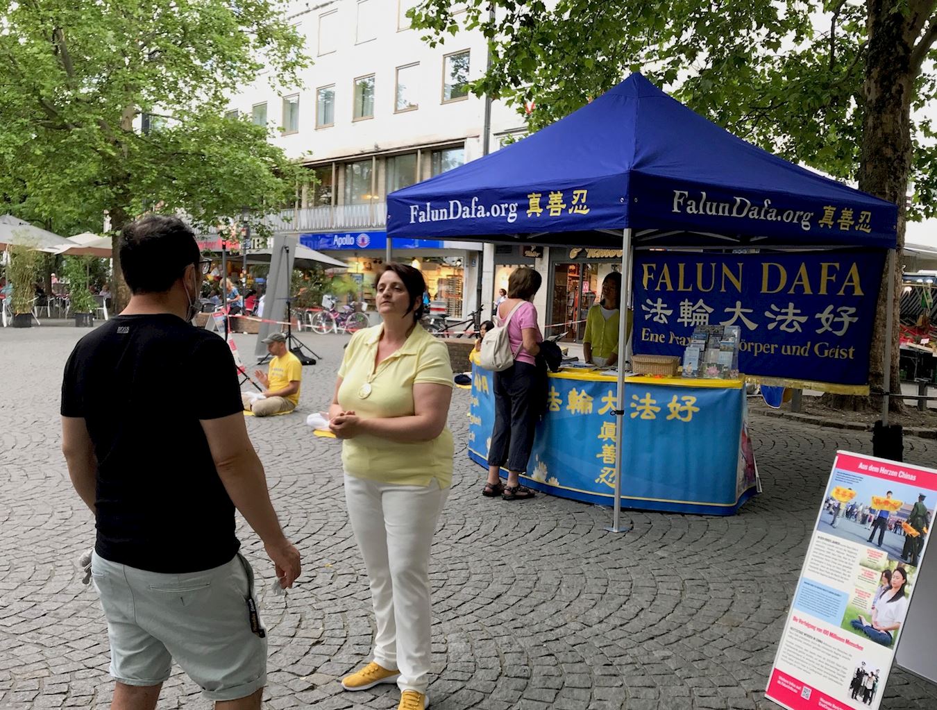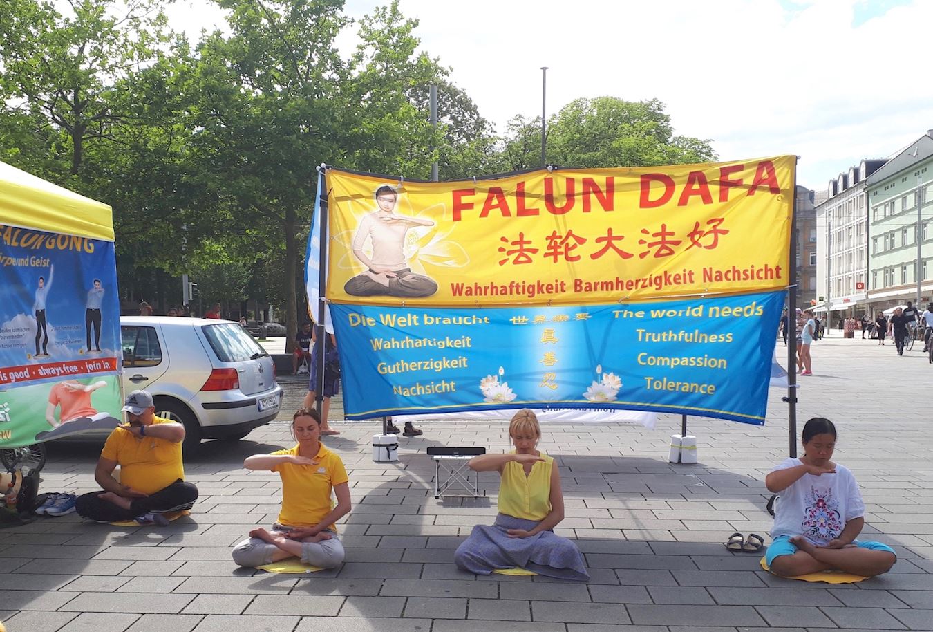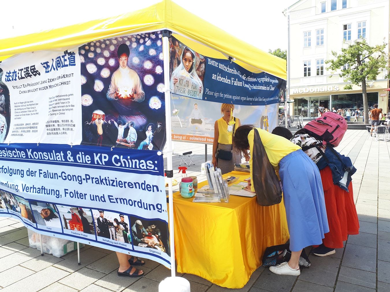 在市中心国王广场(Königsplatz)法轮功学员的信息台很醒目,过往的人仔细观看这些介绍法轮功、揭露中共迫害法轮功及中共活摘法轮功学员器官的展板。法轮功学员展示功法演示,征集民众的签名。当人们了解了法轮功是什么,中共为什么要迫害法轮功和中共对法轮功犯下的滔天大罪之后,纷纷在给德国政府的请愿书上签名。