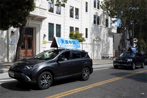 法轮功学员的真相车队从旧金山的城市大学出发,在旧金山小中国城列治文区和日落区来回巡游,之后来到中共驻旧金山领事馆,环绕中领馆,告诉世人“中共是邪灵,正在毁灭人类”、“远离中共、远离瘟疫”。